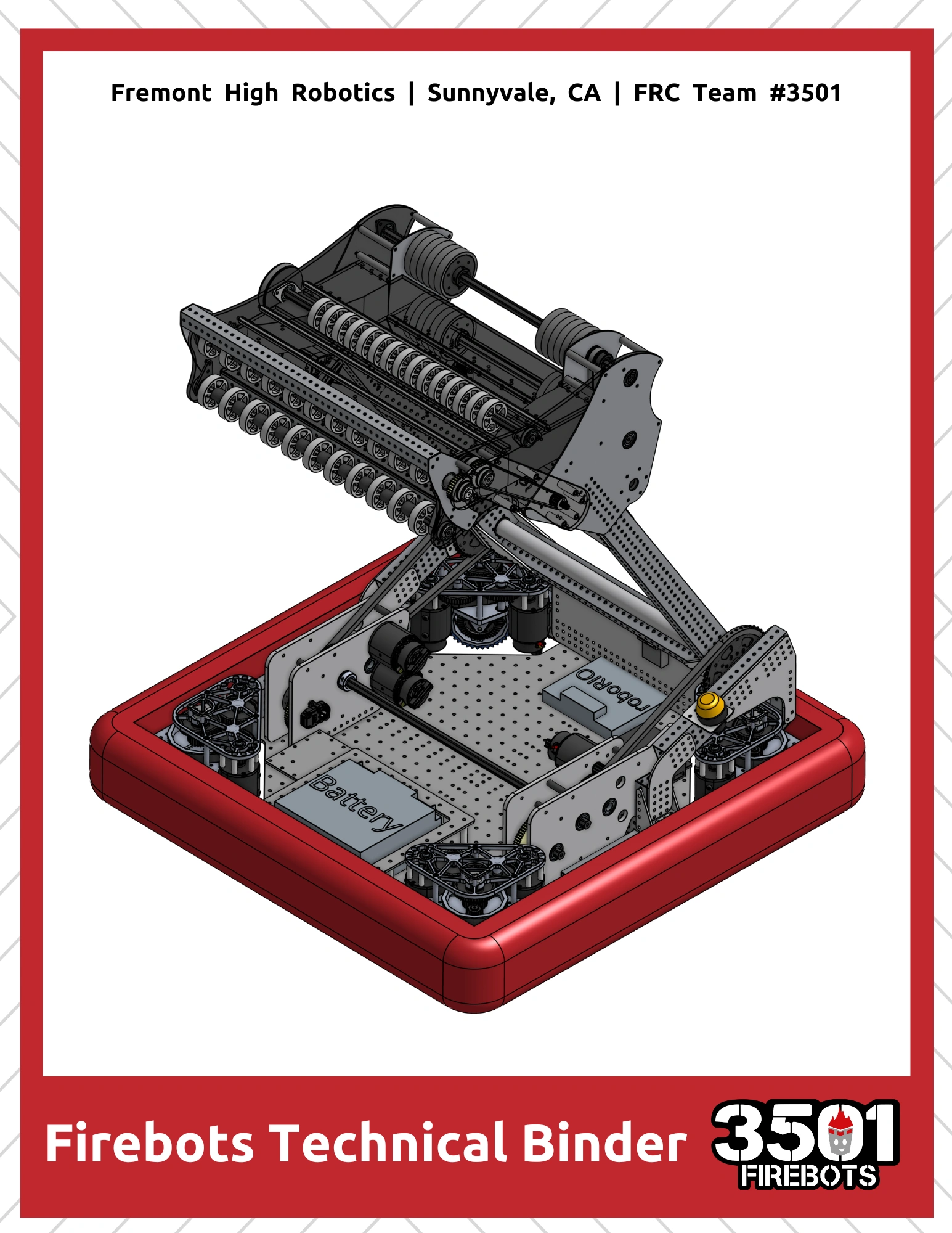 Maneuverable swerve drive with MK4i modules enable top speeds of 17.1 ft/sec. Low center of gravity from 3/16" 1008 Steel that prevents flipping during high acceleration.