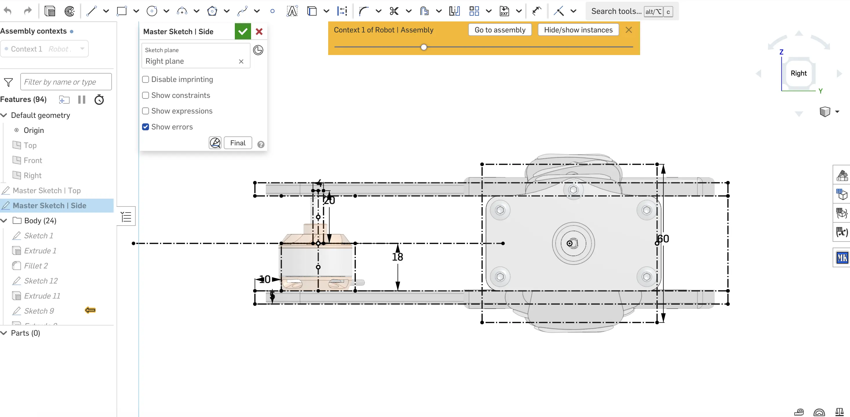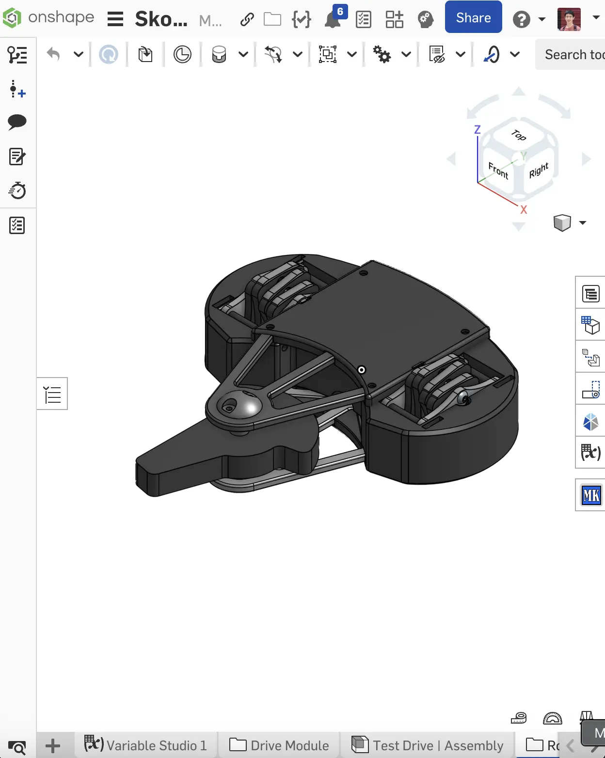 The cad process was slightly different for this project. Individual drive segments were developed seperately from the rest of the robot, and later integrated together. This meant that the master top and side view sketches give a spaceclaim requirement that the modules have to fit inside.