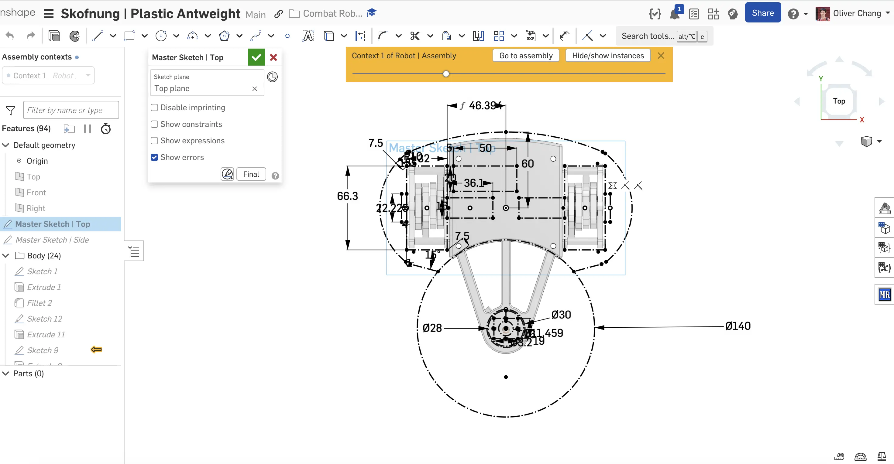 From there, the rest of the side/top view sketches defines the critical dimensions and locations of all major components, including the motors, weapon assembly, and linkage pivot points. Every other part in the assembly is parametrically linked back to this master sketch.